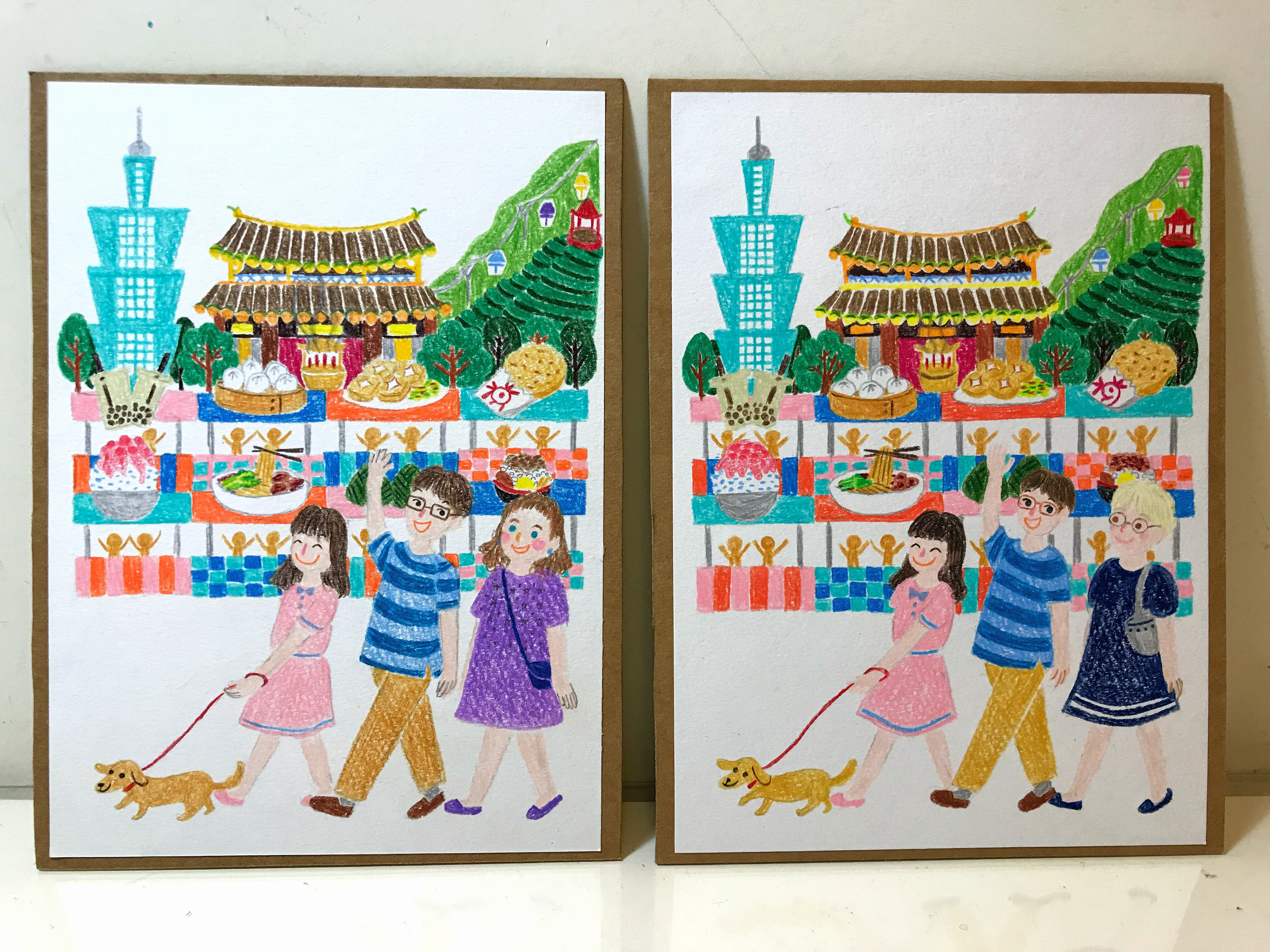 A series of handmade cards customized for a good friend of mine. He was going to give four cards to four of his foreign friends. As his request, he would like the cards to show the fun of Taipei, including his family (himself, his wife and their lovely dachshund) and his foreign friend in the picture.